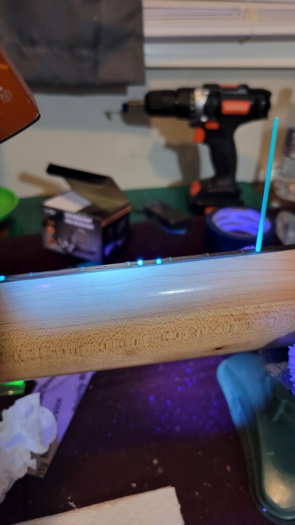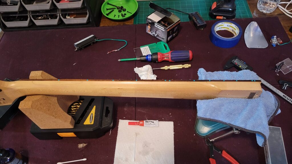 Once the holes are drilled, it’s time to install the new material. You only need one or two drops of superglue. The more you use, the more sanding you’ll have to do later, so if you’re not planning to refinish the back of the neck, it’s best to keep it minimal. I also recommend putting a drop on a paper towel first to see how runny it is (no, I definitely didn’t learn that the hard way).