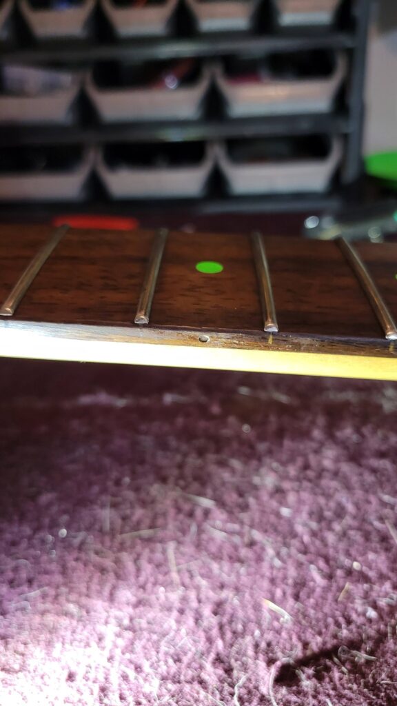 Almost ready for reassembly! Start by cleaning off any remaining dust from the fretboard edges and the rest of the fretboard. Then rub on some lemon oil or your preferred fretboard conditioner. I like Music Nomad F1 oil, but anything similar will work. This will make the edges of your fretboard look like new, and you’ll end up with side dots that look fantastic, are much easier to see, and appear like they were installed at the factory.
